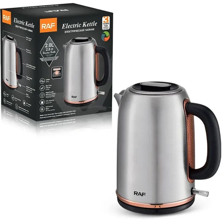 کتری برقی راف RAF مدل R 7850 دارای بدنه ای از جنس استیل ضد زنگ است و طراحی زیبایی دارد. این کتری 2 لیتری با داشتن شبکه های فیلتری کوچک، هر گونه رسوب را از آب میگیرد تا آب جوش آمده از کیفیت بالاتری برخوردار باشد.